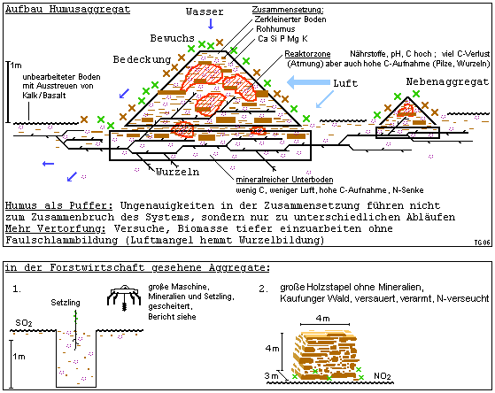 Erläuterungen zu Zeichnung Fläche 1 und Mitarbeit von Forstamt und Universität: Bisherige Diskussion: Ich meinte öfters "da wächst nichts mehr" (siehe oben Wüstenvergleich), ein Förster meinte "das sieht ja eher nach gartenbaulichen Maßnahmen aus" (s.u.), ein Forstdirektor meinte "das dürfen wir nicht" (daher habe ich ein paar Jahre länger ausgeholt und dann Hessen-Forst angeschrieben), ein Jagdpächter meinte "sobald Wurzeln beschädigt werden, stirbt der ältere Baum am Pilz" (dies habe ich widerlegt, beschädigte Wurzeln in guter Humuserde erholen sich schnell und erobern mit enormer Geschwindigkeit das ganze Aggregat), und ein Bodenkundedirektor meinte, ich müsste erstmal 10Jahre Bodenkunde studieren. Bodenverbesserungen im Wald beschränken sich auf Forstarbeit (Mischwald und Kalk/Basalt-Schotter auf Wegen), flächendeckende Kalkungen (aber nur bis pH 3,8 , Link bei Hessen-Forst.de) und manchmal findet man einen leeren Sack KP. Ich versuche punktuelle Bodenverbesserungen mit Erdkomposten. Dabei werden soviele Mineralien gegeben wie ohne Nährstoffverlust vertragen wird (Boden-neuaufbau, Wurzeln, Humus, Puffer, Seiteneffekte). Diese "gartenbauähnlichen" Maßnahmen mit Erfahrung und individuellen Aggregaten sollen natürlich mit maschineller Unterstützung ausgeweitet werden. Ein Negativbeispiel sind die 4-oder 6Beiner, die vor Jahren im Osten gescheitert sind (auf SO2-toten Hügeln Mineralien 1m in Boden gemischt von Großmaschine, dann Setzling rein). Dabei wurden überhaupt nicht die Faktoren beachtet: Luft, Wasser, Nährstoffe. Entweder der pH-Wert wird erhöht, dann werden zuviele Nährstoffe frei für die Bodensituation, oder es wird zu wenig gegeben, der pH-Wert bleibt zu niedrig. Auf eine solche Bodenkunde verzichte ich. Stattdessen führe ich ein Aggregat vor, dass nicht unter Luftmangel oder Wasser-, Nährstoff- und Protonen-Überschuss leidet. Bei meiner Bearbeitung stehen im Vordergrund die Anlage von Erdkomposten für die Wurzeln, maschinelle Teildurchführung, wissenschaftliche Begleituntersuchungen zu Nährstoffverlusten, volkswirtschaftlicher Nutzen, und nicht so sehr die gesamten chemischen Feinheiten. Wenn die Wurzeln ökologisch wachsen und nachgewiesenermaßen nichts verlorengeht, ist es gut genug. Entsprechend einem Begründer der Bodenkunde, Prof.Sekera `43: "Der Land- oder Forstwirt soll der Hausarzt seines Bodens sein", und nicht der Pathologe. 2 Mineralienfeld und Kontrollfläche. 3 Feuchtgebiet 4 Bearbeitung älterer Fichtenreihen mit Seilwindenpflug. Dies ist ein erster Mechanisierungsversuch, mit mitteltiefem Pflug (starke Verankerung und hohe Leistung), Hilfseinrichtungen wie Wendeblech, Mineralienbehälter, Vorkrümler, und mit reichlich Handarbeit. Die Geschwindigkeit ist enorm niedrig, aber besser als reine Handarbeit. Breite ca. 1m, Wurzeln freilegen und unter Erdkompost plazieren. 5 Hektar mit durchschnittlicher Bearbeitung wie Steinpilzzuchtgebiet (Humusbearbeitungen und Pflege von Wildwechseln). Die 10ha für die tatsächlichen Steinpilzzuchtversuche (d.h. Förderung von Mycelien und Aussetzung) liegen etwas entfernt (= Fläche 2, direkt an Straße). Austausch mit interessierten Instituten (Keine vergleichbaren Erfahrungen vorhanden, man studiert dort z.B. die Stoffwechselvorgänge, neuester Bericht: die Bäume lösen die Fruchtung aus durch Hormone oder so; man ist weit von der Zucht entfernt, begrüßt aber wenn ich Einnahmen für den Wald erziele). 6 älterer Buchenbestand mit Kalk/Basalt, Seilpflug und vielen kleinen Bearbeitungen. Untersuchungen wie oben (Boden, Wasser, Ökologie), Uni KS C-Gehalt: Ein Ziel der Bearbeitung ist die Erhöhung des C-Gehaltes. Biomasse (Rohhumus): Anfangen mit 3facher Jahresproduktion von 10facher Fläche (ca. 30 kg TS/m², in Umgebung gegen Mineralien tauschen), Importbiomasse muss sauber sein. Recherche zu Erfahrungen mit großen Holzaggregaten ohne Mineralien in Kaufunger Wald (teils über 10t Stapel aus Ästen und Stammresten), kombinieren mit Mineralien. Wildschutz: Beratung und Aufsicht durch Hr.Burkert vom Reg.präs., in Absprache mit Förstern. Anlagen: |