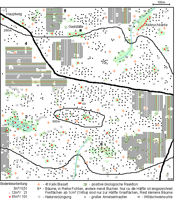 Thomas Gossmann Bodenbearbeitungsprojekte Stand Sept06 Liste der Beteiligten wie von Hessen-Forst angefordert Um allen Beteiligten und Interessierten die Humusbearbeitung zu veranschaulichen, habe ich ein Funktionsschema angefertigt sowie eine maßstabsgetreue Zeichnung von Fläche 1 (1km² Hügel an Fulda). Das Problem ist dort: 2 Millionen Tonnen beschädigte Erde (auf ca.1m Tiefe). Dieses Problem zunächst per Hand anzugehen, scheint relativ sinnlos. Mit der Zeichnung soll gezeigt werden, wie die geplante Humusvernetzung aussieht, so dass mit nur 2000t bearbeiteter Erde (darunter noch wenig Maschinenarbeit) tatsächlich ein strategischer Einfluss ausgeübt wird. |
