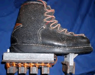Try finding the original magnetic astronauts boots that were developed by NASA. The original boots were excellent. For the acceptance tests, an engineer clad as an astronaut walked across the bottom of a steel beam in a high bay research area, upside down against the pull of Earth's gravity. He stepped as he walked, putting his foot "down" and then picking it "up". There is no problem in finding magnets strong enough to hold the astronaut firmly in such an upside position. The problem with simple magnetic boots using such strong magnets is that, once the foot is planted, unless he is King Kong himself, the astronaut cannot pick up the foot again. However, the Radus boots completely solved that problem. If the permanent magnet fields are switched off for that foot that the astronaut wishes to lift, he can lift it easily and take another step. Then if the fields are switched on again as he places his foot down, this switching of the fields allows him to walk in a manner resembling normal walking, though a little slower. To do that switching by normal "battery and coils" would be prohibitively bulky and heavy — and awkward to say the least. With the Radus boots, the astronaut could pick up his foot by simply switching off the permanent magnetic fields easily. They switched on again when he placed the foot down. And he did not have to carry a huge battery around with him, to furnish enormous current to do that. |