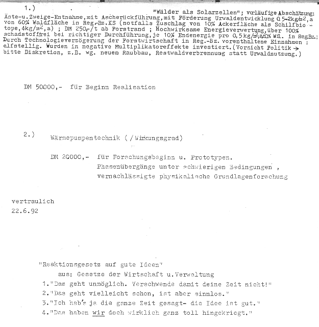 Sehr geehrter Hr.Hilgen, ich bitte um Unterstützung beim Aufbau einer interdisziplinären Umweltstiftung, zwecks Schaffung von Arbeitsplätzen. Mit Hilfe von freiwilligen Beiträgen von Wissenschaftlern und Hartz4-Kräften kann ich Arbeitsplätze schaffen, in Form einer kommunaleigenen, unverkäuflichen Stiftung. Ich bitte um entsprechende Termine, ab heute 12Uhr, um sofort die ersten 20-50 Beschäftigungsgelegenheiten und die ersten 100.000€ Einnahmen klarzumachen. Ihre Mitwirkung wird benötigt, um festzustellen, dass ein politischer Wille da ist, Leute volkswirtschaftlich sinnvoll in der Landschaft zu beschäftigen. Anders kann man nicht die übermäßig vielen ineinander verschachtelten Genehmigungen bekommen. Zunächst bräuchte ich mindestens 4 Hauptgenehmigungen, um in 3 Forstbezirken kleine Bodenflächen zu bearbeiten. Dabei geht es um interessante Themen wie Grundwasser, Rekordbuchen, Steinpilzzucht, ökologische Biomasse,etc. Dies natürlich auf der Höhe der Wissenschaft; entsprechend sind finanzielle Erfolge multiplizierbar. Die volkswirtschaftlichen Tätigkeiten, die ich durchführen kann in versch. Bereichen, ergeben jetzt schon schätzungsweise 200.000 nützliche und motivierende Beschäftigungsgelegenheiten, entsprechend bis zu 1Mio Wähler, daher die Eile. MfG ThGossmann 0561 573152