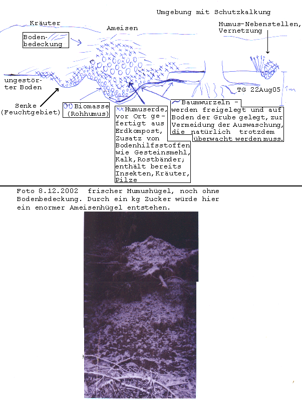 Ich kann mit Hartz4-Kräften und Hilfe der Universität volkswirtschaftlich sinnvolle Arbeitsplätze aufbauen. Besonders sinnvoll, damit möchte ich anfangen, sind Naturschutzgebiete, die auch noch Geld abwerfen. Hierfür benötige ich kleine Waldflächen in 3 Forstamtsbezirken. Diese Flächen sollen durch Bodenbearbeitung in ökologisch wertvolle Flächen umgewandelt werden (ohne formalen Naturschutzgebiet-Status), welche auch noch Erträge abwerfen. Die Bodenbearbeitung erfolgt zunächst per Hand (Aufbau von Humuserde, Bodenwasserkapazität, Bewurzelung etc.) in Form kleiner Hügel und Senken. Entscheidend ist dabei, dass die durch die Bodenentwicklung freiwerdenden Nährstoffe sofort durch Wurzeln aufgenommen werden, daher sind nur kleine Aggregate möglich (10-100t). Die Ergebnisse dieser "Einzelanfertigungen" (an die Situation angepasste Humushügel) müssen wissenschaftlich ausgewertet werden, dann kann man mehr dieser Maßnahmen durchführen, mit noch zu entwickelnden Maschinen wie Baggerschaufel auf Holzbalken, Seilwinden mit Verankerung u.a.. Es wurde schonmal mit solchen punktuellen arbeitsintensiven Maßnahmen ein Waldgebiet saniert, vor über 200 Jahren: Jemand hat es volkswirtschaftlich möglich gemacht, dass 17000 Einzelmaßnahmen durchgeführt wurden, die dann einen flächendeckenden Effekt erzielten. Es handelte sich um Laubbaum-Anpflanzungen, die durch einen Nadelbaumgürtel geschützt wurden. Heute muss man mehr den Boden berücksichtigen - teils schwere Strukturschäden, die oberirdisch durch Stickstoffwachstum aus Abgasen teils "kompensiert" werden. Als Ergebnis der schon von mir durchgeführten Humusbearbeitungen haben sich alle wesentlichen Indikatoren vervielfacht: Artenzahl, Biomasse, Wasserkapazität, Wurzelraum u.ä.. Bereits während der Arbeit interessieren sich Wild, Frösche, Greifvögel, Insekten etc. für das Humusgebiet. Der Haken an solchen Maßnahmen ist der hohe Aufwand (Kosten u. wissenschaftl.Begleitung). Daher sollte man froh sein, dass überhaupt jemand soetwas durchführt. Im folgenden habe ich 3 Maßnahmen aufgeführt, für die ich sofort Genehmigungen benötige. Es folgen dann diverse volkswirtschaftlich sinnvolle Projekte mit der Universität.
