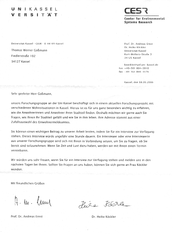 Ich gelte vermutlich als Indikatorperson für Kassel und Umgebung, d.h. Ausrottung der gesamten Gegend. Dies habe ich bspws. Bürgermeister Sattler öffentlich erklärt (Hofgeismar, Ex-Lehrer), kurz danach erschien der passende Artikel bei nature.com: "Tschernobyl ist gut für die Umwelt". Wieder nur Zufall ? Sehen Sie sich all die zufälligen Erdbeben, Wahlen, AlKaidaVideos etc. an, soviele Zufälle gibt´s ja garnicht.