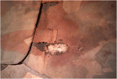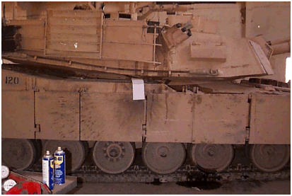 Dokumentation Durchschusskanal Militärbericht cheniere.org 1.Einschlag in Kettenschürze hinter Schütze (verdeckt durch weißen Zettel) |